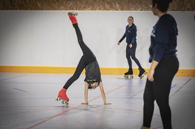 Envie de boule à facettes pour commencer l’année ? Rendez-vous au gymnase Léo-Lagrange samedi 10 janvier de 19h à 22h pour une soirée disco comme à La Main Jaune : comme sur des roulettes ! 3€ l’entrée, 2€ la location de patins. En attendant, à l’entrainement, même si les patineuses sur quads de l’USF ont profité d’un samedi soir où les rinkeurs du Sporting Hockey Club n’avaient pas match à domicile, ce n’était pas encore ambiance Saturday Night Fever ! Isabelle Huet, présidente de la section : « Nous préparons les programmes. 26 compétitrices sont en lice cette saison(ndr: la section compte 140 adhérents), depuis l’échelon régional jusqu’au niveau N1, en free, équivalent du patinage artistique, ou en danse, sur du fox trot, du tango, une valse… » Du disco ? Sur le track (la piste) et sur du Amy Winehouse, Alexane, 12 ans, en N3 cette saison, fait la roue ; oui, avec ses huit roulettes aux pieds ! « Il faut acquérir une maturité technique avant de penser à composer un programme. Notre école de patinage est très rigoureuse et réputée: on a même un créneau mutualisé avec le rink. » Alexane prend de la vitesse, conseillée par Élisa Mori, qui la suit de près, et la filme, smartphone en main : « Mets de l’attitude! » Élisa enchaine au coaching avec Lucie (junior, N2), qui roule sur un air de tango. Elles croisent Clara, qui encadre Leatitia (junior N3), Louise qui veille sur Lina et Naïs (niveau régional)… ça patine dans tous les sens, des prouesses d’équilibristes de partout ! Élisa : « Les plus aguerries encadrent les plus jeunes. Les programmes doivent être prêts pour mars, où vont se jouer les qualifications pour les championnats de France. Nous allons bientôt les présenter à un juge pour profiter de ses remarques. Un programme en N1, c’est dix heures de travail. On réfléchit aux figures, à la musique, mais quand on chausse les patins, la créativité se libère! »