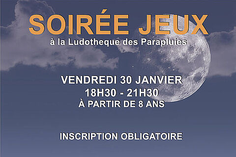 InscriptionsLe 30 janv. 2026 SOIRÉE JEUXLe 30 janvier de 18h30 à 21h30. La ludothèque des Parapluies vous invite à sa soirée jeu annuelle. Au programme : jeux de société, concours....