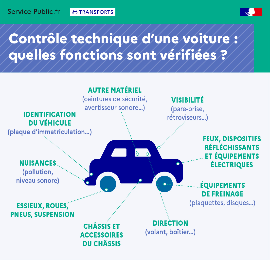 Les fonctions vérifiées lors du contrôle technique d'une voiture sont les suivantes :